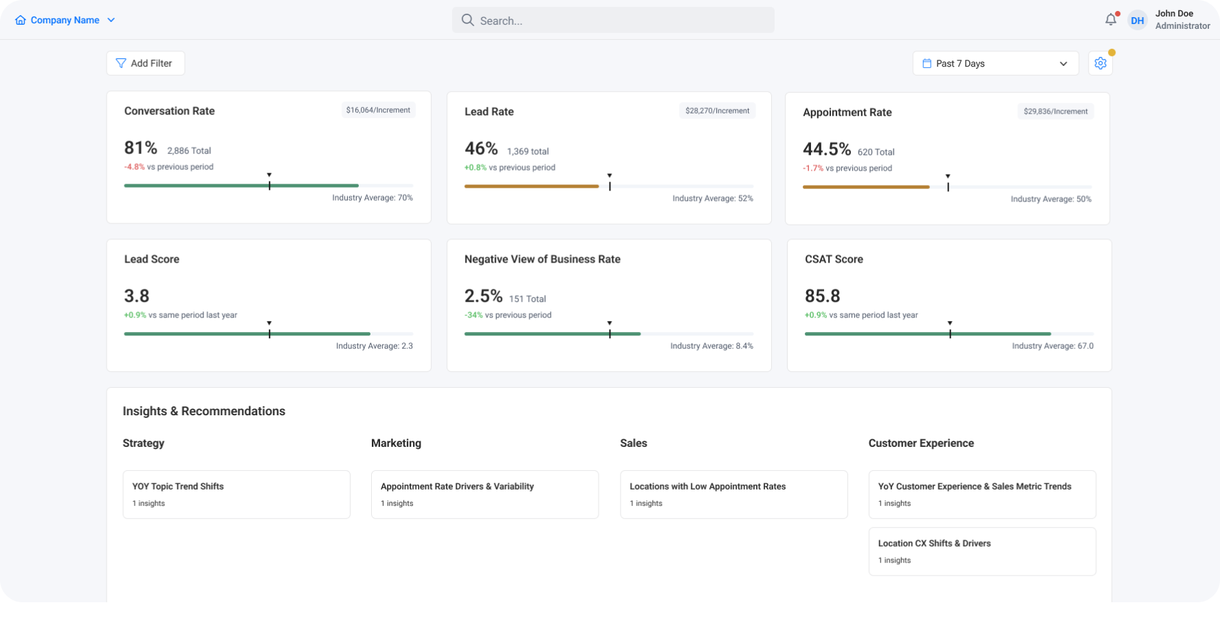 The Key Insights Dashboard from Marchex transforms complex conversational data into actionable intelligence, empowering business leaders to drive measurable growth. By orienting users to their performance across critical metrics, benchmarking against industry standards, and delivering clear, prescriptive recommendations, the dashboard reveals not only what is happening in your business but why — and most importantly, how to improve.